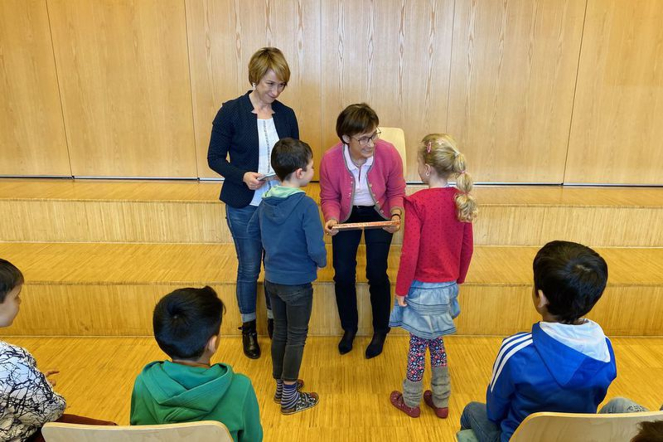 Rund drei Dutzend Schülerinnen und Schüler aus Klasse 2 lauschten gespannt und konzentriert wie die Vizepräsidentin des Landtags aus den Kinderbüchern „Es klopft bei Wanja in der Nacht“ und „Lillemi und Wolf“ vorliest. Immer wieder stellte Sabine Kurtz Fragen über die Geschichten an ihr Publikum, welche die Schüler mit großem Eifer beantworteten. Die beiden Kinderbücher zeigen durch anthropomorphische Tiere, dass ein friedliches Miteinander auch zwischen sich Fremden möglich ist, wenn jeder auf andere Rücksicht nimmt. Die Vorlesestudie des Instituts für Lese- und Medienforschung zeigt, dass Kinder, denen regelmäßig vorgelesen wird, über einen deutlich größeren Wortschatz verfügen, im Schnitt bessere Noten schreiben und später mehr Spaß am Selbstlesen und im Umgang mit Texten haben. Etwa ein Drittel der Eltern lesen ihren Kindern allerdings zu selten oder nie vor.